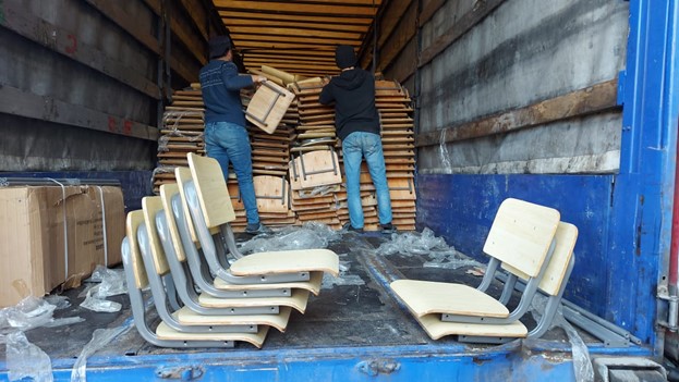 The delivery included two items of playground equipment, two seesaws, two spring riders, 700 desks for students, 46 teacher desks, 84 teacher chairs, 61 bookcases, 45 whiteboards and 22 computer tables.
